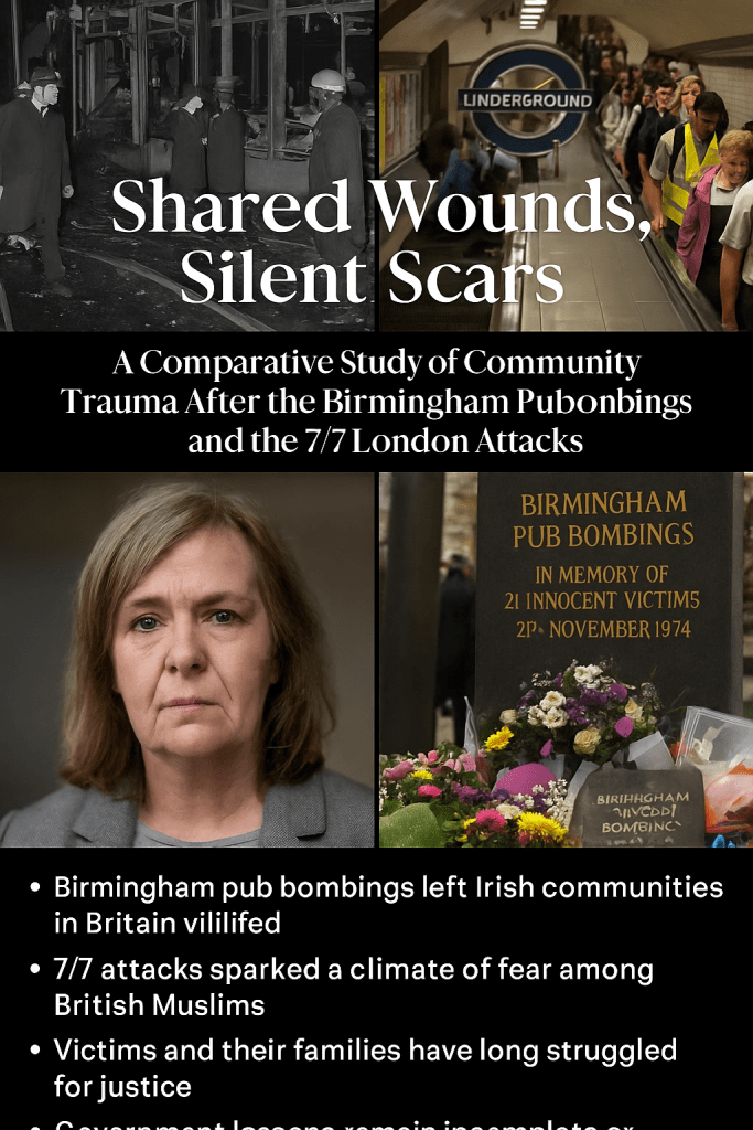 Terrorism not only aims to destroy lives but often reshapes the identity and cohesion of entire communities. The Birmingham pub bombings of 1974 and the London bombings of July 7, 2005 (7/7) stand as stark reminders of violence perpetrated in the name of ideology. While the former is rooted in the nationalist struggle of the Provisional IRA and the latter in radical Islamist extremism, both events led to devastating loss and trauma. However, beyond the immediate devastation, the bombings had long-lasting psychological and social consequences for two distinct minority communities: the Irish in Britain and British Muslims. This paper explores the lived experiences of survivors, the ripple effects on their respective communities, and the systemic failures that exacerbated their suffering. By analysing survivor testimonies and public responses, the study reveals striking parallels in how communities become collateral damage in the aftermath of terror.