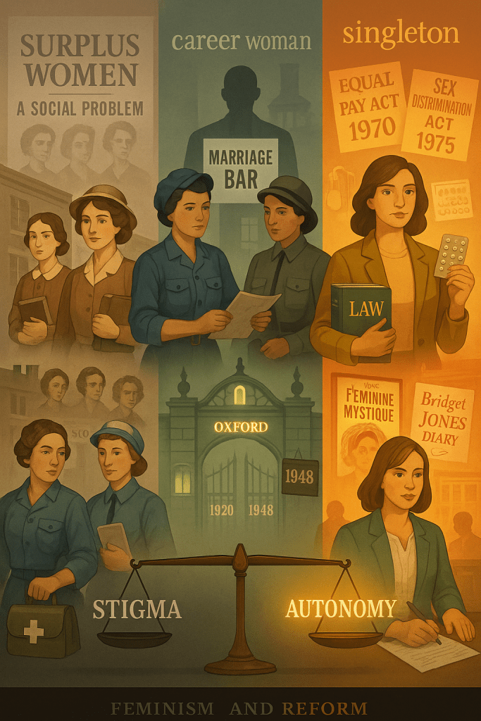 Legislative reforms reflected these shifts. The Divorce Reform Act 1969 liberalised divorce, while the Equal Pay Act 1970 and the Sex Discrimination Act 1975 secured workplace rights. These reforms eroded the assumption that marriage was women’s economic destiny, making singleness a more viable and respected choice.